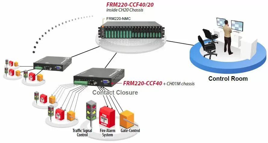 The FRM220-CCF contact closure fiber converter comes in two models, one with 2 channels (CCF20) and one with 4 channels (CCF40) and provides the transmission of contact closure over a single fiber optic link. With SFP cage on fiber ports, the FRM220-CCF gives you the fiber cabling connector SFP-LC, both multi-mode and single-mode, as well as BiDi which allows bi-directional transmission using only a single fiber core. The FRM220-CCF has contact inputs and 0.5 amp contact output relays. The relay output follows the “relay input” from the remote end. When the remote “relay input” is shorted, the local relay output is closed and vice-versa. Any one of the relay outputs can be configured to close when “carrier loss” is detected from the remote end. (Either through a CH01M console or via NMC in managed chassis.) Carrier Loss indicates that the optical fiber is disconnected or that the remote end has lost power and is not operating. This "carrier loss" relay can then be connected to an appropriate alarm circuit.