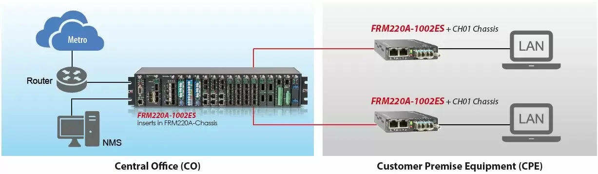 The dual copper and dual fiber Gigabit Ethernet switch (FRM220A-1002ES) designed to make conversion between 10 / 100 / 1000Base-T and 100 / 1000Base-SX / LX with SFP connector. With SNMP and Web-based management in the FRM220 or FRM220A chassis the network administrator can monitor, configure, and control the activity of each FRM220A-1002ES switch card locally via the chassis management.