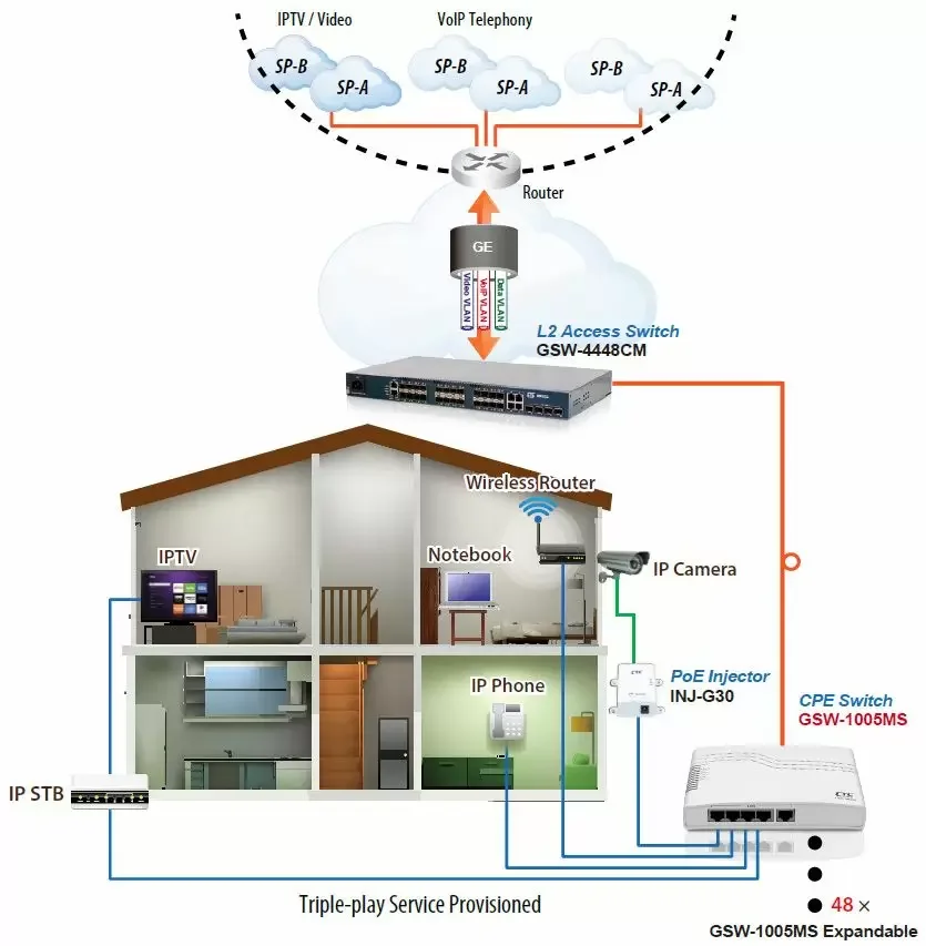 CTC Union technologies unveils the initial generation CPE switch, GSW-1005MS, which is equipped 5 ports 10/100/1000Base-T RJ45 and 1 port 100/1000Base-X SFP based fiber optics for P2P FTTH service. The transmission distance of Gigabit Ethernet over RJ45 copper can be extended up to 100km over a fiber optics interface. GSW-1005MS has an optional cable tray that allows the installer to enclose the excess fiber within the unit, thus providing protection for the sensitive fiber at subscriber side.