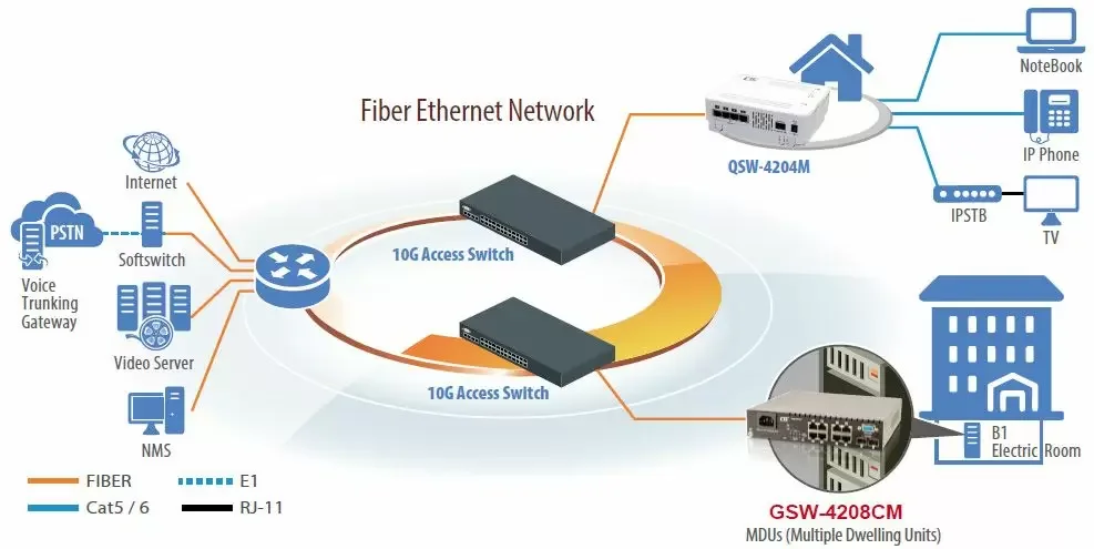 The GSW-4208CM Ethernet switch provides VLAN, QoS and IGMP L2 feature sets as well as robust security management to facilitate service provider and MIS team of enterprise build out of a manageable and secure Ethernet access network rapidly. The redundant power design can increase the high network availability due to the power supply outage unpredictably.