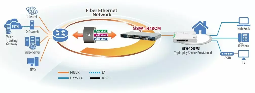 The GSW-4448CM is equipped with 48 1000Base-X CSFP ports included 4 Gigabit combo ports (RJ45 or CSFP slot) and 4 1G/10Gbps dual rate SFP+ slots. This switch is targeted at multi-service operators (MSO) with a desire to deploy provisioned multiple play services via active Ethernet FTTx network infrastructures. The GSW-4448CM Ethernet access switch provides VLAN, QoS and IGMP L2 feature sets as well as robust security management to facilitate service provider's build out of a manageable and secure FTTx access network.