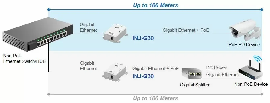 This device consists of 1 PoE Injector port. It can solve the limitation of the power outlet location and offer the system designer a flexible solution to locate the PD network device everywhere. The compact size and wall mounting was specifically designed for easy installation. It can be installed where space is limited; moreover, it provides smooth network migration and easy upgrade to network capacity.