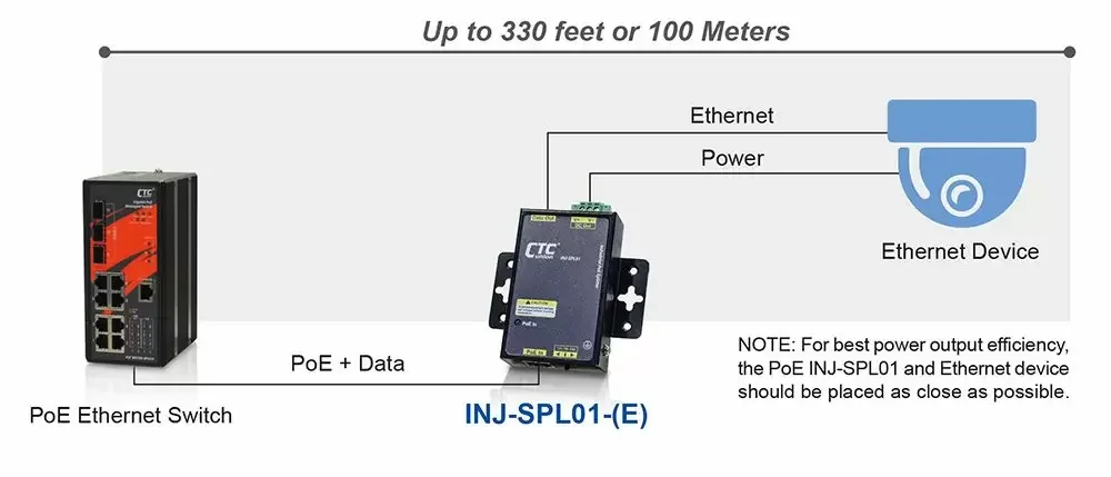 The industrial-grade Gigabit Ethernet PoE splitter INJ-SPL01 can be powered by PoE power source equipment passing the IEEE802.3af/at standard, separating data transmission and 12/19/24Vdc power to non-PoE equipment. It is designed for harsh environments and can be used in industrial networks, traffic monitoring, safety automation applications, urban security, and smart transportation systems. It is also suitable for many military or utility market applications where environmental conditions exceed commercial product specifications.