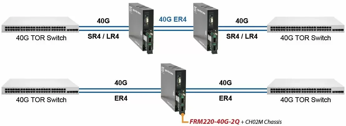 The FRM220-40G-2Q is a 40G QSFP+ to 40G QSFP+ 3R transponder that provides media conversion and distance extension for 40G Ethernet links. The FRM220-40G-2Q meets the growing need for more bandwidth for data centers and enterprises. The emergence of high-end servers and Ethernet switches with 40G Ethernet interfaces increases the need for media conversion (multi-mode to single-mode) and link range (single-mode to single mode) extension. The FRM220-40G-2Q is hot-swappable with two QSFP+ sockets for 40G QSFP+ transceivers. The installation and setup is simple plug and play. The FRM220-40G-2Q can be inserted into any powered FRM220-CH20,CH08, CH04 chassis or CH02M, CH02/SMT standalone chassis with QSFP+ transceivers required for the application.