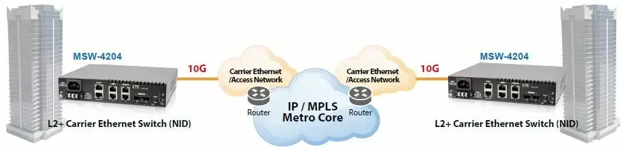 The next generation Carrier Ethernet Network Interface Device (NID) is designed for business connection in Ethernet virtual connection technology. The MSW-4204 is equipped with 2 SFP+ slots, dual rate 1G/10Gbps and 4 ports Gigabit RJ45 network interfaces. It can beconfigurable as either UNI or NNI device which are CE(Carrier Ethernet) 2.0 compliant for Metro Ethernet network deployments.