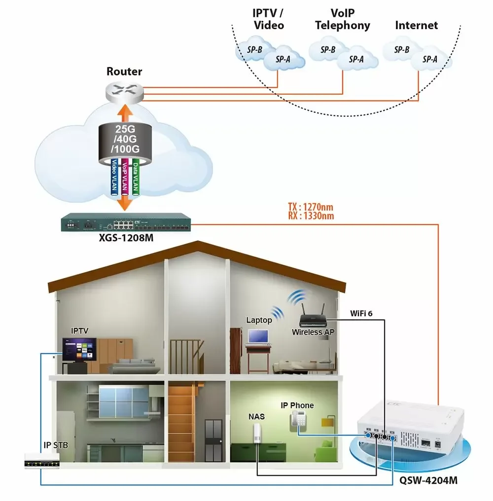 CTC Union Technologies unveils the next generation CPE switch, QSW-4204M, which supports multigigabit technology for active Ethernet based FTTH application. This new CPE switch is designed with 1 ports 10M/100M/1Gbps RJ45 and 4 ports 10M/100M/1G/2.5Gbps as well as 2 ports 1G/10Gbps SFP+ based fiber optics. As usual, the QSW-4204M adopts the evolutionary cable tray structural design to help the installer more easily and protectively manage the excess fiber within the unit.