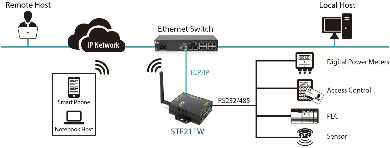 The serial to Ethernet wireless device server (STE211W) and serial to Ethernet device server (STE211) provide a bridging device to connect RS-232/RS-485 Serial Data communications to hardwired Ethernet networks or WiFi wireless networks. It connects serial devices such as PLC, alarm sensors and PTZ camera control to IP networks. Applications include industrial/factory automation, public safety, and surveillance systems. The Serial converter is built for use in light industrial environments, featuring a compact wall-mount design. It operates from 9-32VDC power supply voltages with terminal block connectors and is easy to configure through its web GUI interface.