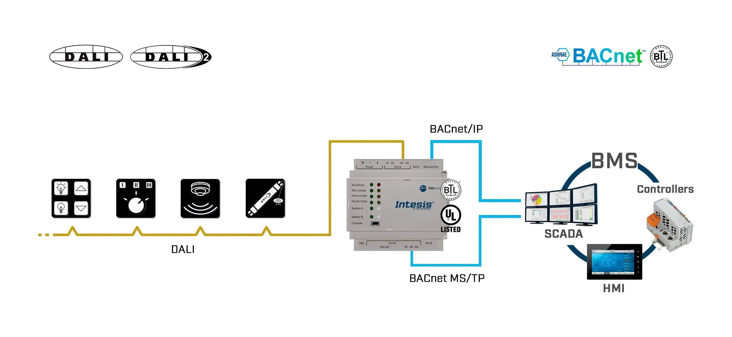 Integrate any DALI/DALI-2 driver and DALI-2 input devices like light or occupancy sensors with a BACnet BMS or any BACnet/IP or BACnet MS/TP controller. This integration aims to make DALI devices and their data and resources accessible from a BACnet-based control system or device as if they were a part of the BACnet system and vice versa.
