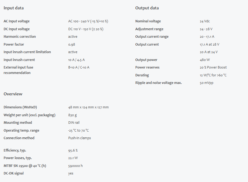 DC output 24 - 28 Vdc20 - 17.1 A480 W
