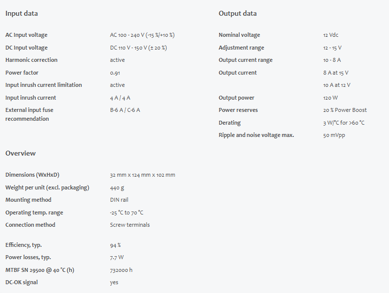 DC output12 - 15 Vdc10 - 8 A120 W