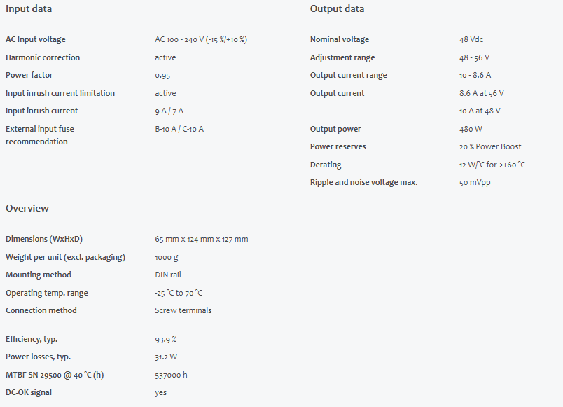 DC output48 - 56 Vdc10 - 8.6 A480 W