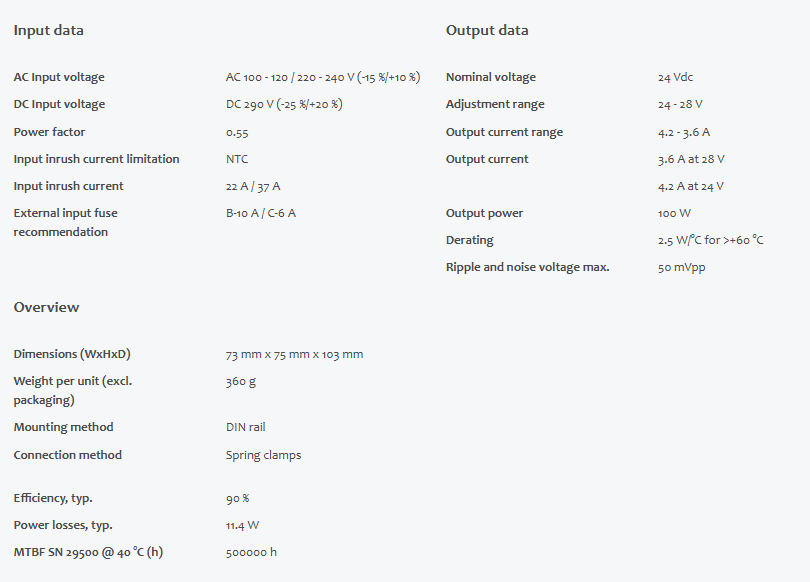 DC output24 - 28 Vdc4.2 - 3.6 A100 W