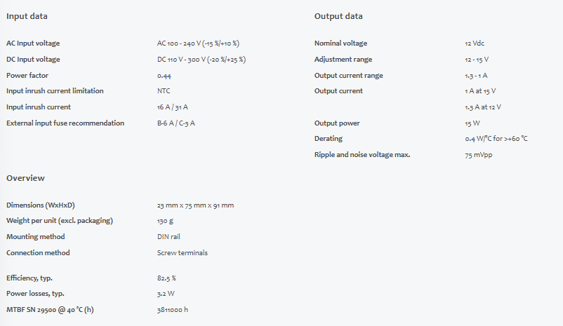 DC output12 - 15 Vdc1.3 - 1 A15 W