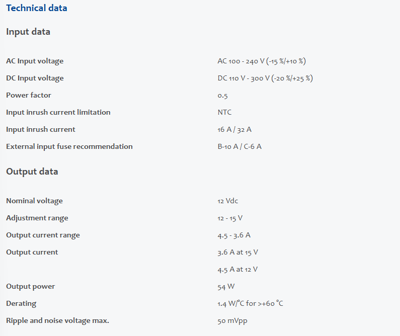DC output12 - 15 Vdc | 4.5 - 3.6 A |54 W