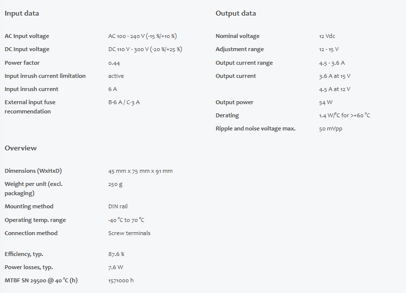 DC output 12 - 15 Vdc4.5 - 3.6 A54 W
