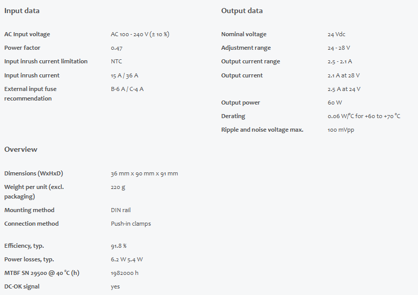 DC output24 - 28 Vdc2.5 - 2.1 A60 W